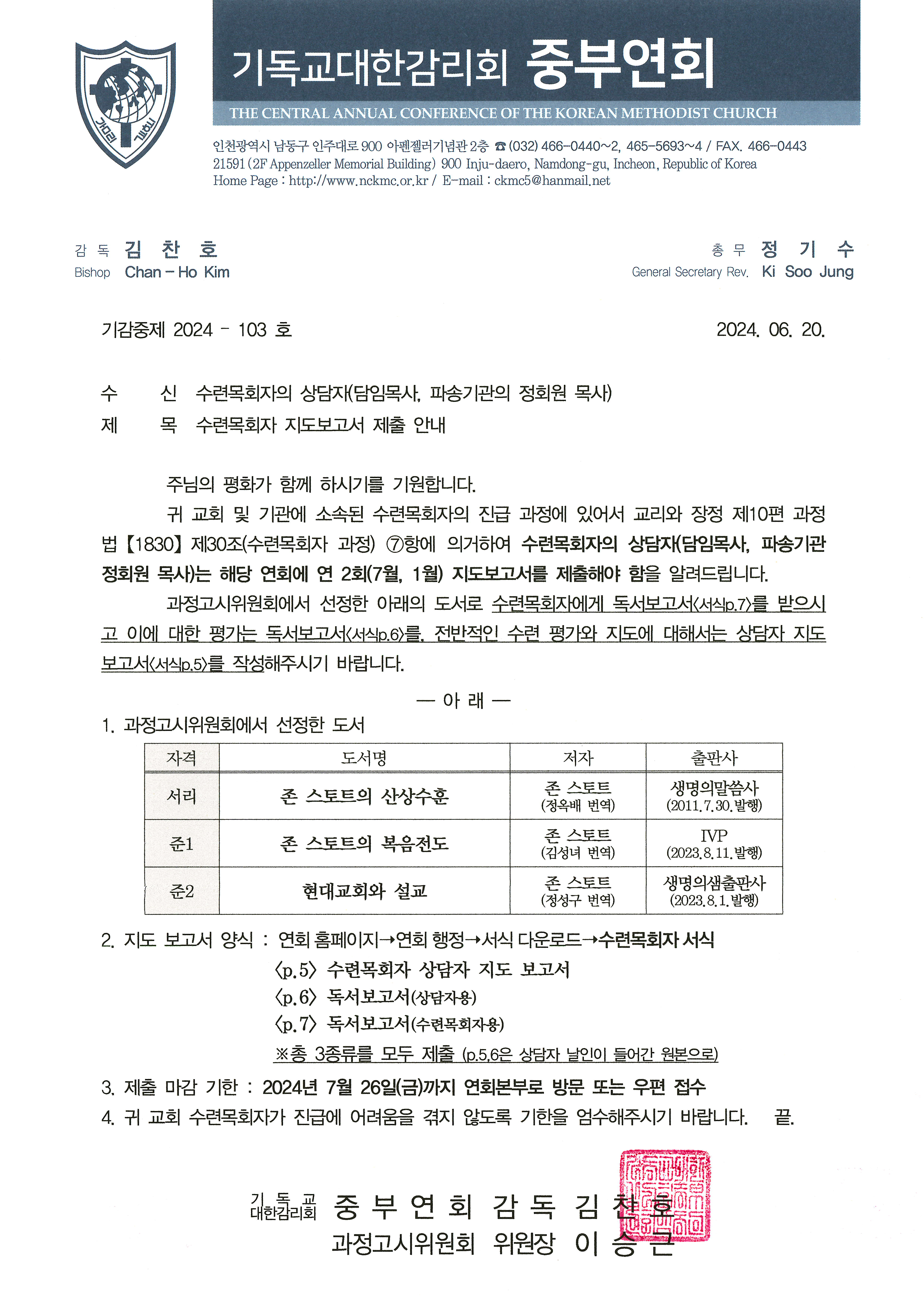 수련목회자 지도보고서 제출 안내(2024년 7월 제출)