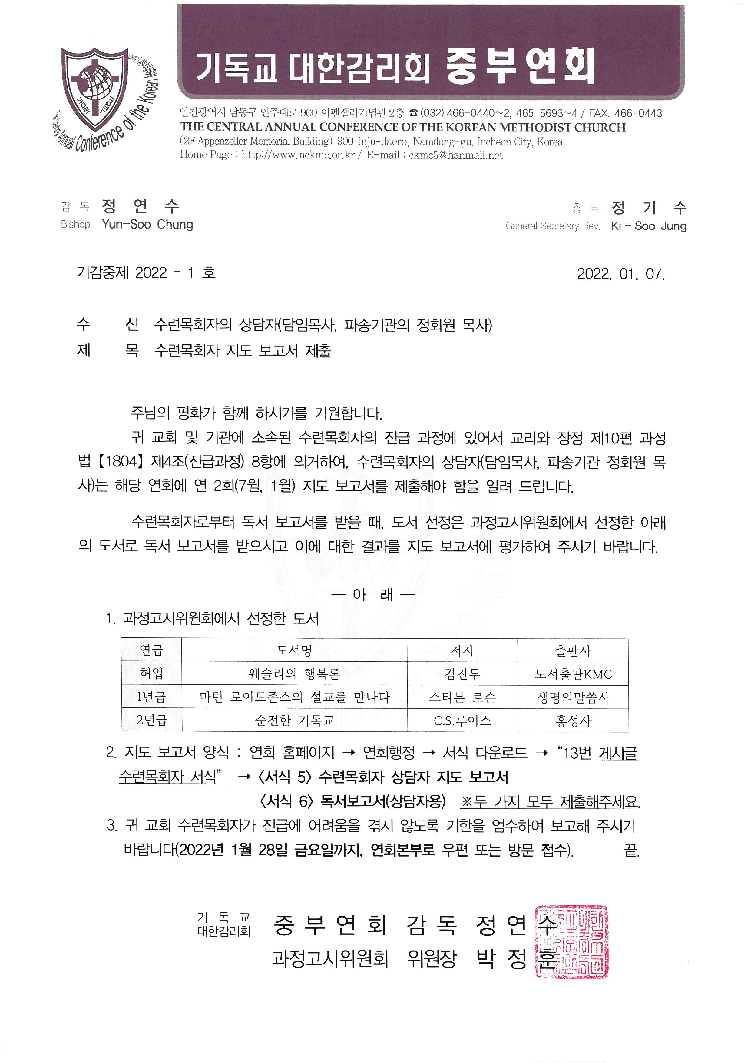 - 귀 교회 수련목회자가 진급에 어려움을 겪지 않도록 기한을 엄수하여 보고해 주시기 바랍니다(2022년 1월 28일 금요일까지, 연회본부로 우편 또는 방문 접수).